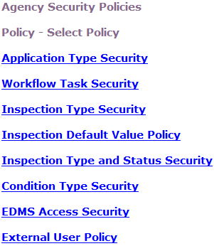 Civic Platform displays the Agency Security Policies-Select Policy page.
