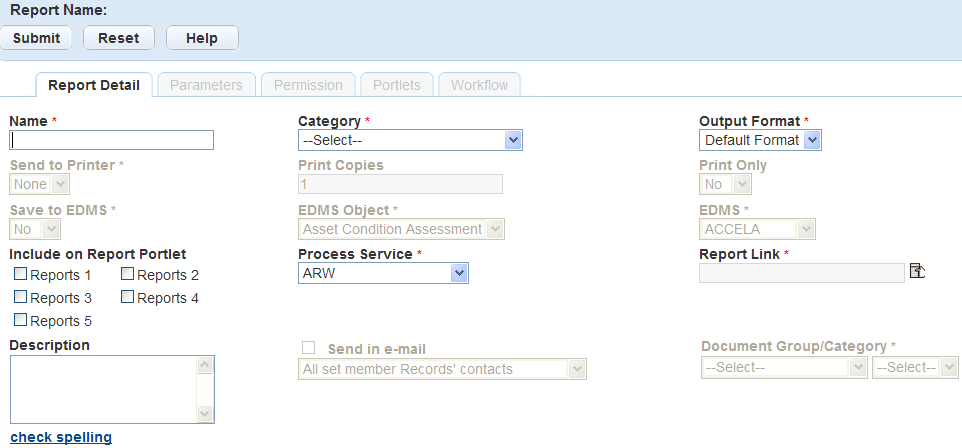Name Enter the name of the report. Category Select the category the report should display under. Report Service Select the client-side executable report service. For example, select MS Excel EXE or MS Word EXE. - Click Submit..