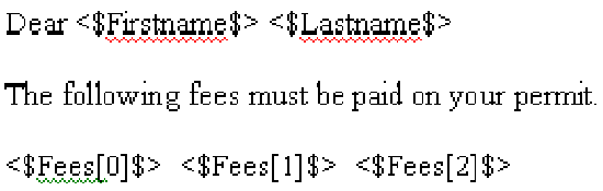 In Figure 5, Civic Platform replaces <$Fees[0]$>, <$Fees[1]$>, and <$Fees[2]$> with a list of fee values from executing the following SQL statement: