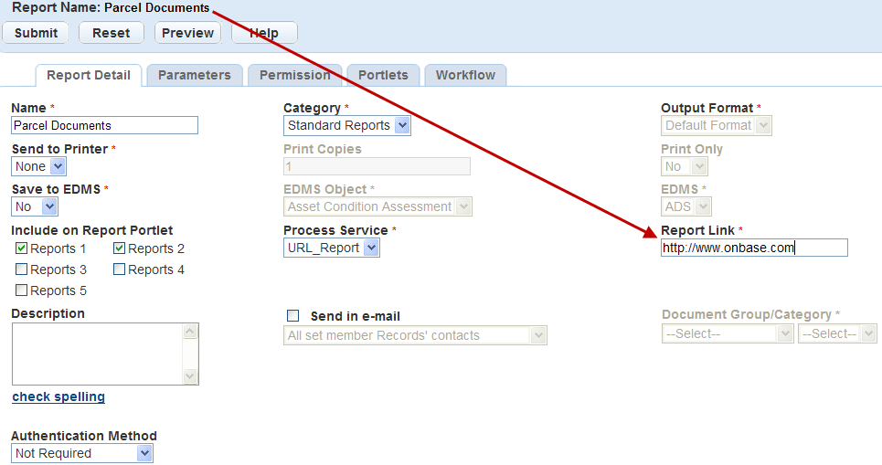 Name Enter the name of the report. The name you enter displays in the Report Portlet or portlet-specific report menu. If this is a Permit Print report, enter Permit Print. Category Select the category the report belongs to. Report Service Use the drop-down to select the URL_Report report service. Report Link Enter the URL to the report source. For example, enter http://permit.accela.com. To pass static parameters, include them in the URL address. For example, enter http://permit.accela.com/PERMITID07BBP-00000-0010. To pass Accela-provided parameters, you must add parameters in the Parameters portlet. You might also need to accommodate the end of the URL to accept the parameter with /index.jsp so that the parameter value matches the following example: http://permit.accela.com/index.jsp/permitID=07BBP-00000-0010. For instructions on adding parameters, see Setting up Report Parameters. Note:You must specify the server name (not IP address or domain) in the report link URL if you want to apply NT authentication for the report. Here is an example of the report link with NT authentication: http://reporting/ReportServer$SQL2K5.