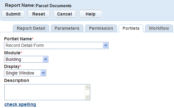 Name Enter the name of the URL link. The name you enter displays in the Report Portlet or portlet-specific report menu. For example, enter “Support.” Category Select the category the report belongs to. For example, enter “Company Information.” Report Service Use the drop-down to select the URL_Report report service. Report Link Enter the URL to the website or service. For example, enter “http://www.accela.com/support/support_overview.asp” - Click Submit..