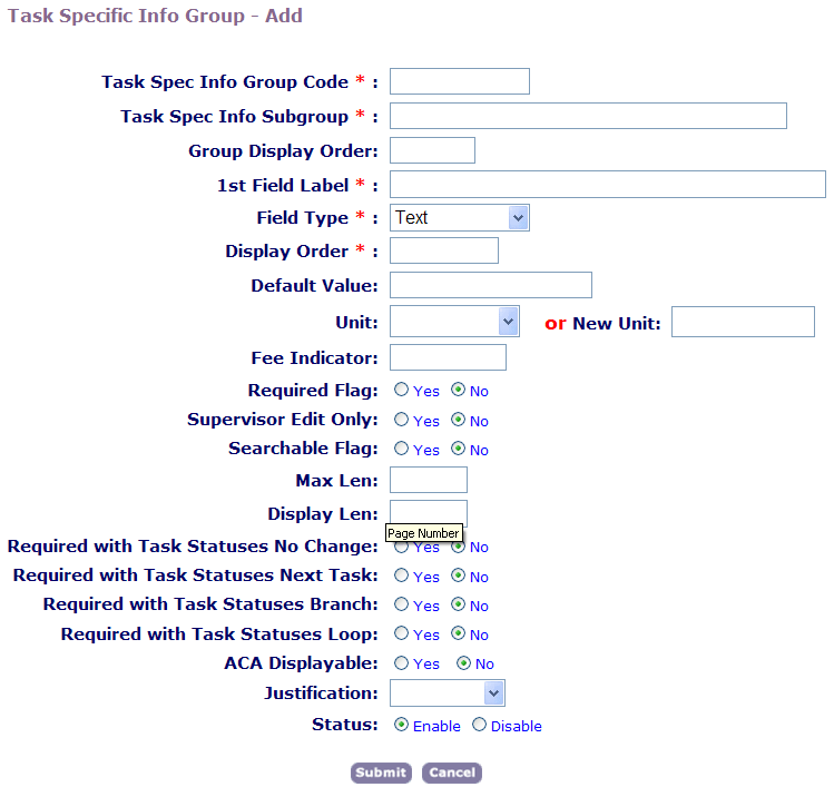 Task-Specific Info Group Code Enter the group code associated with the Application Specific Information group you want to search for. Task-Specific Info Group Name Enter the name of the group you want to search for. There can be many groups in one category. This name only applies when there is more than one group in a category. - Click Submit.