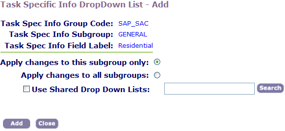 - Locate the task-specific information group to which you want to apply a shared drop-down list. For instructions, see Editing a Task-Specific Information Group.
