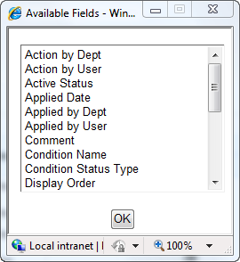 - For each field you want to display on the summary, select the field and Click OK on the Available Fields page. To manage fields, click Available Fields.