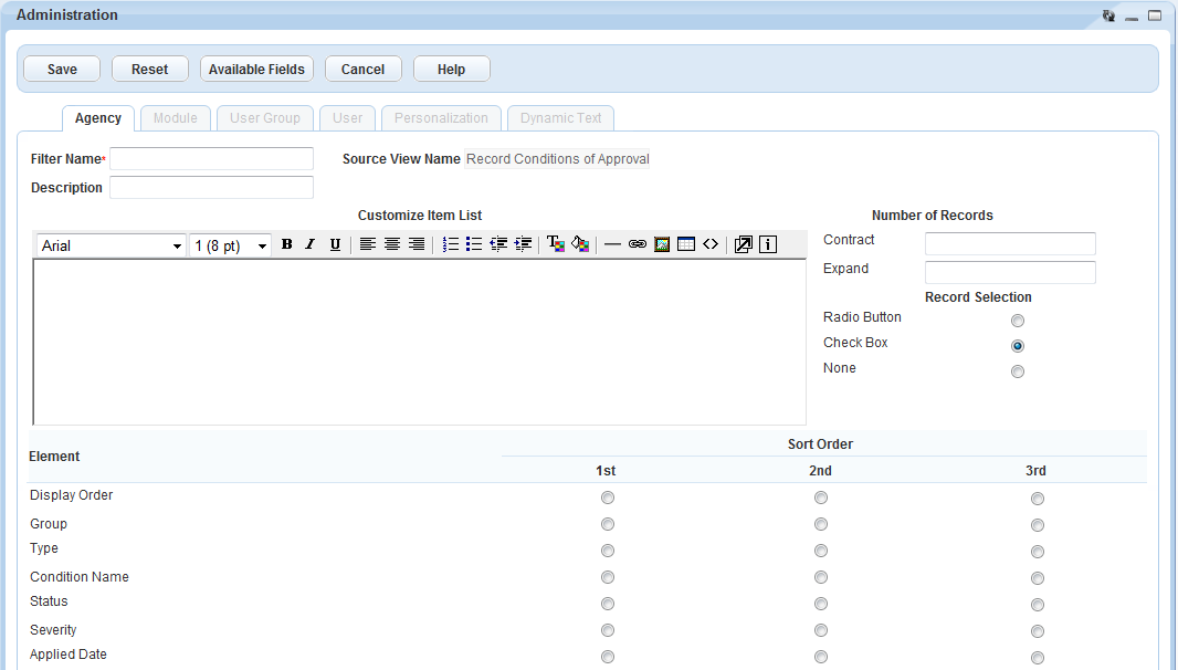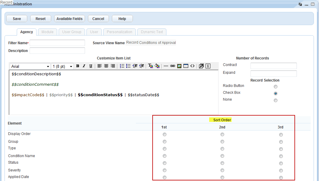 Note:Do not select the Display Order field, as Civic Platform does not allow you to sort conditions of approval by display order.