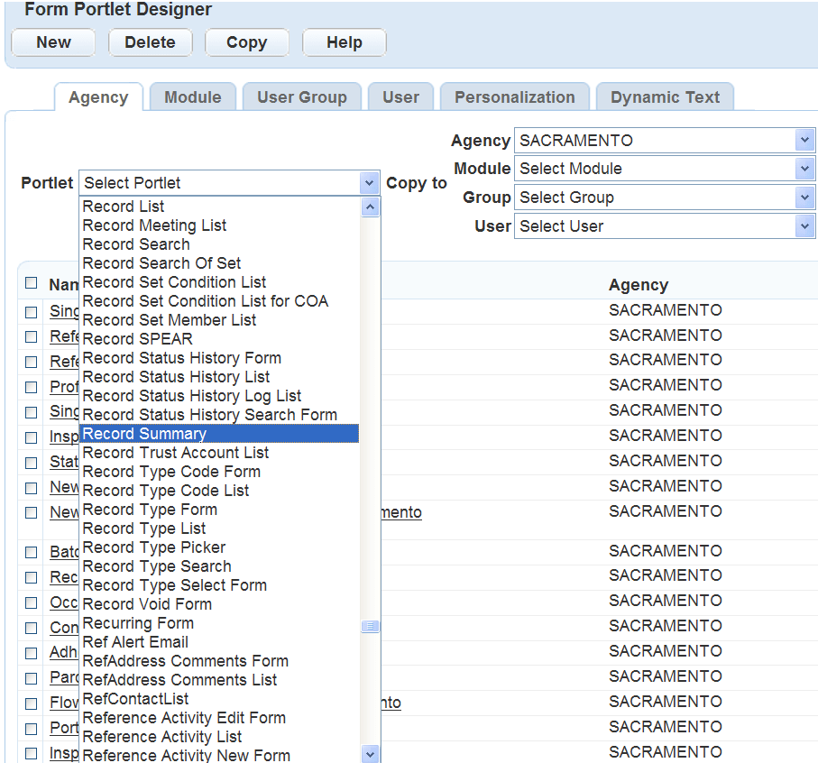 - From the Record Form Portlet, select the Agency > Module > Group > User > and Tab folder for whom you want the Summary tab to display.