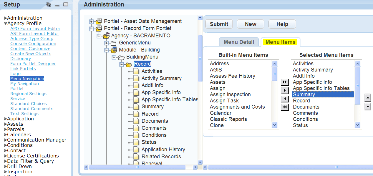 - From the Setup portlet, click Agency Profile > Menu Navigation.