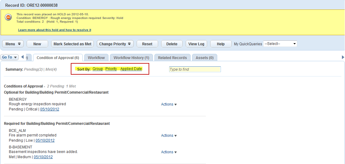 You can also decide which condition of approval fields appear as links in the Sort By area on the Conditions of Approval tab. By default, the Group, Priority, and Applied Date links are available in the Sort By area. Clicking a Sort By link sorts the conditions of approval by the corresponding field. Civic Platform sorts the conditions of approval by group, type, status type, severity, and then priority, if users do not click any of the links in the Sort By area.