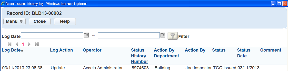 Table 1. Record Status History Audit Log Fields Action By The individual responsible for the application status modification. Action by Department The department responsible for the application status modification, such as Pending or Open. Comment Any comments related to the application status history update. The comments that display in the audit log can be those a user entered manually or those that Civic Platform populates by predefined Standard Comments. Status The status of the inspection record inspection status, such as Approved, Pending, or Denied. Status Date The date Civic Platform applied the current status. Status History Number A number automatically generated to identify and track the status history changes.