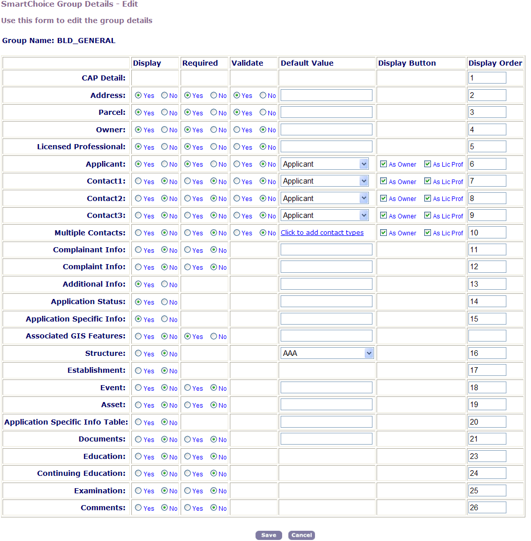 To enable the Structure and Establishment sections in application intake forms for application types associated to this Intake Form Configuration Group, select the Yes option in the Structure and Establishment fields.