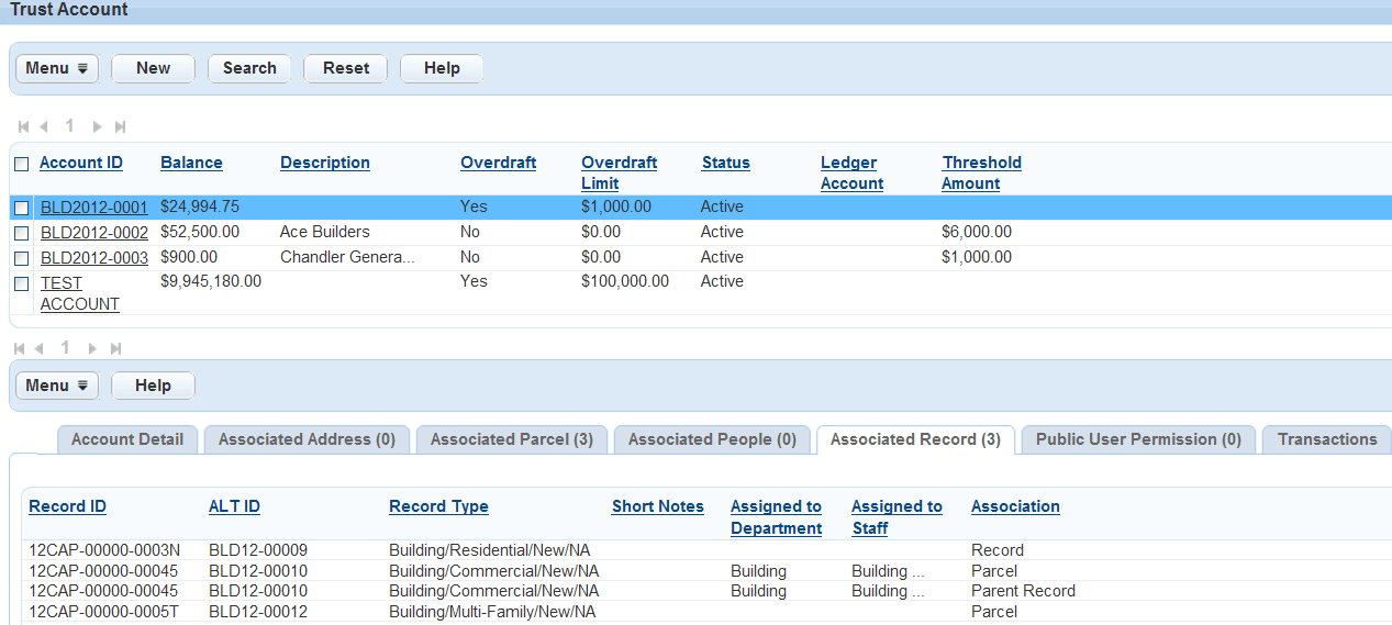You can associate a trust account with parcels for one or many records. This is a useful feature if the user or administrator wants to track billing for fees on the record, or set up automatic payments for record fees. If there is a lock on a parcel, you cannot associate it with a trust account until you resolve the lock.