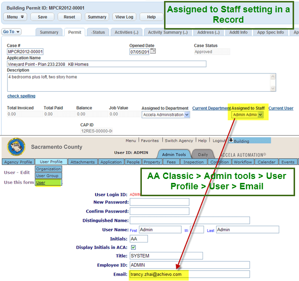 To send email notifications to an Accela user, configure their email address in their user profile in Civic Platform (Classic Admin > Tools > User Profile > User). Then select that user profile in the “Assigned to Staff” setting of a record associated with the trust account, as illustrated here: