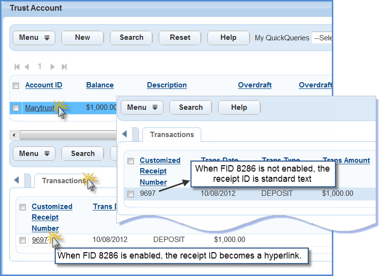 Enable full access to FID 8286: Fees Print Receipt Summary. Enabling this FID does two things: it enables customized receipt summaries, and it transforms the receipt ID field on the Transactions tab of the Trust Account portlet from static text to a hyperlink (shown in the sample screen below), giving users easy access to the receipt summary.