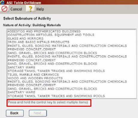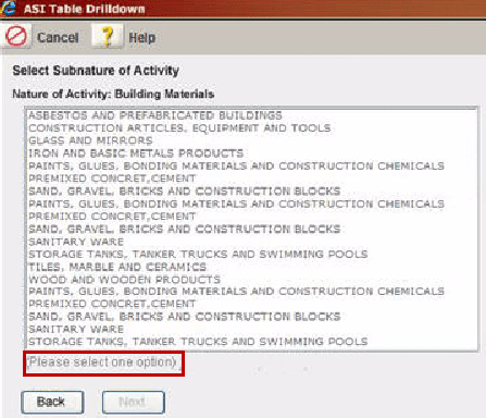 For example, your agency can create a drill down for Business License applications. The first drill-down lists the nature of the license, such as Agriculture, Bakeries and Confectionery, and Building Materials. If the user selects Building Materials, the next drill-down lists materials such as Paints and Bonding Materials, Tiles and Ceramics, and Wood and Wooden Products. If the user selects Wood and Wooden Products, the third drill-down lists options such as Import of Wood, Furniture Repair and Refurbishing, Plywood Manufacture, and Sawdust Collection and Recycling. See the example screen below.