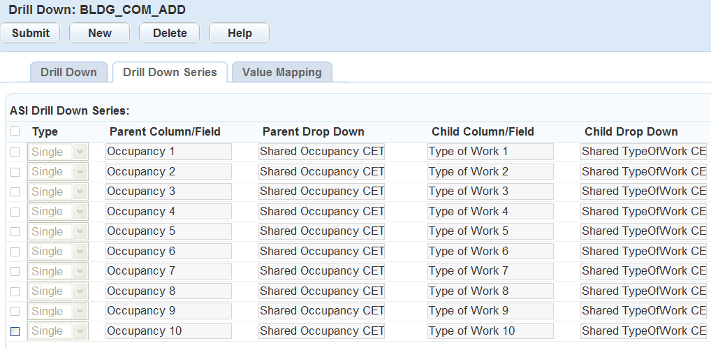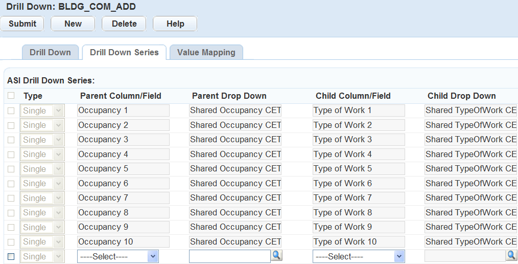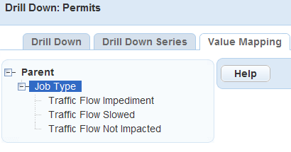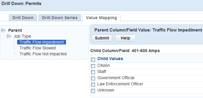 The Value Mapping tab for a drill-down enables the data values in the Child Column/Field to be mapped to the Parent Column/Field data values. The Value Mapping tab for a Custom List drill-down enables the data values in the Child Column/Field to be mapped to the Parent Column/Field data values. You define the data values with shared drop-down lists. The nodes in this level depend on your selections in the Drill Down Series tab. When you create the drill-down field or the drill-down table, all of the values from the shared drop-down list display in the Value Mapping tab, which enables you to use duplicate Child values for multiple Parent criteria. For example, two categories, such as “condominium” and “single-dwelling,” could potentially drill down into the same subcategories of demolition, remodel, and stick-built. An administrator can select “demolition,” “remodel,” and “stick-built” as subcategories of both categories. For more information about shared drop-down lists, see Creating Shared Drop-down Lists.
