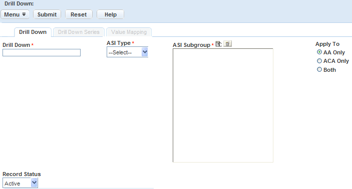 If you want to disassociate multiple Custom Fields subgroups, press the Ctrl key on your keyboard while clicking the unwanted Custom Fields subgroups. After you have highlighted all unwanted subgroups, click Delete.Custom Fields Type Choose either Custom Fields or Custom Lists to determine which type of drill-down to create. Apply To To determine whether the drill-down displays in Civic Platform, Citizen Access, or both products, click the appropriate option. Record Status Select Active or Inactive. Set the drill-down's record status to Inactive while you are working on it and then change the status to Active when it's ready.