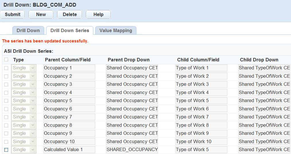 To create additional drill-down levels, repeat sub-steps a - c above. Civic Platform automatically identifies the Parent Custom Fields drill-down type and shared drop-down list as the Child from the previous level. Specify the relevant Custom Lists Subgroup in the Child Column and Child Drop Down for the new level.
