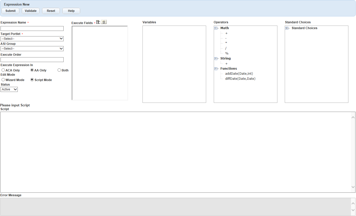 The Script Mode displays the Expression script text area in which you can edit the EMSE script manually. See the Accela Civic Platform Scripting Guide.