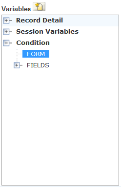 The Variables navigation tree includes Session Variables which are the frequently used runtime variables that are standard with Civic Platform. Session variables are available in the WHERE clause of a statement. Session variables display between sets of double dollar signs, for example,