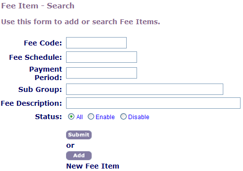 Search for an existing Fee Calc Criteria code by clicking the Submit button.