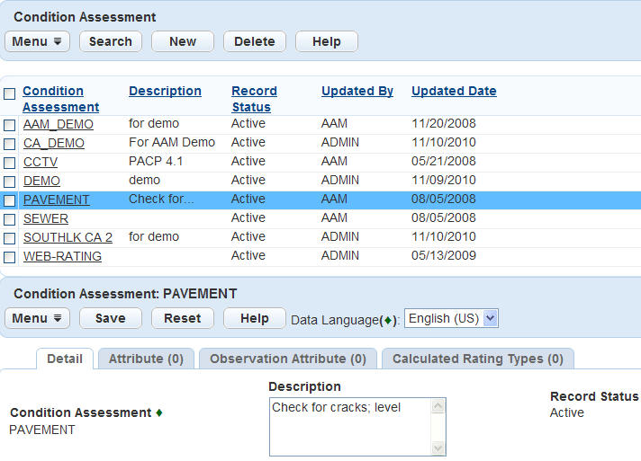 After you create a condition assessment type you can change its description. If the condition assessment type is unused, you can delete it and create a new one.
