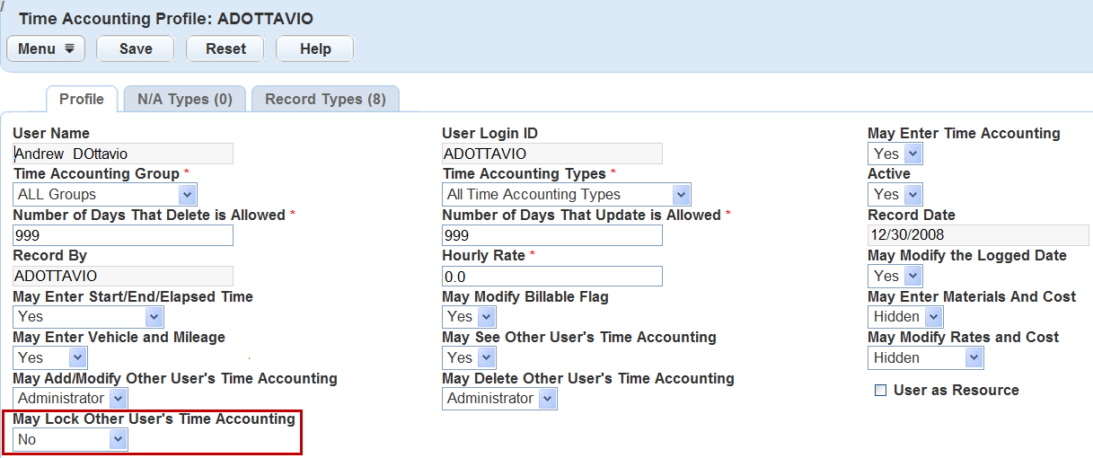 Time accounting administrators and time accounting supervisors can lock other user’s time entries and can edit the entries. During the locking period, the owner cannot update the locked time accounting. Each time accounting entry has a Lock Status field so a user can set the status to locked or unlocked.