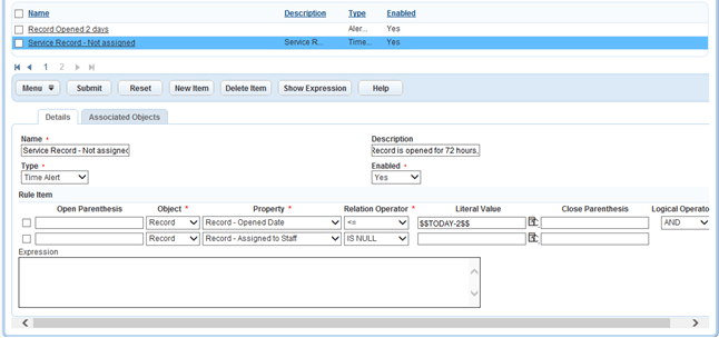 Rule Items: Record - Open Date <= $$TODAY-2$$ AND Record - Assigned to Staff is null