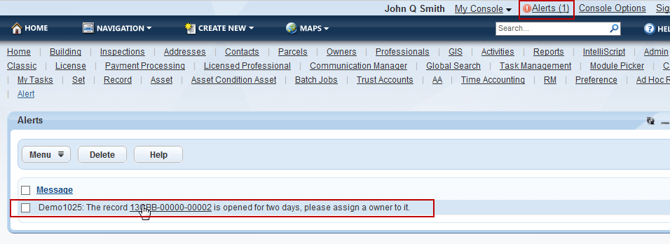 Click the Alerts link at the top of the console in Civic Platform to validate that the alert triggers successfully: