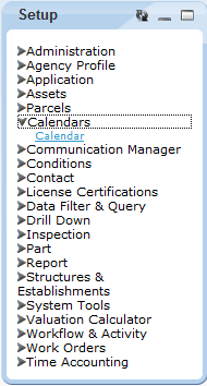 Calendar functionality accessed through the Setup portlet differs from calendar functionality accessed through the main console. This section addresses scheduling of calendar events with the Calendar portlet that you access from the Setup portlet. The Accela Civic Platform User Guide provides information on scheduling calendar events with the Calendar portlet you access from the main console.