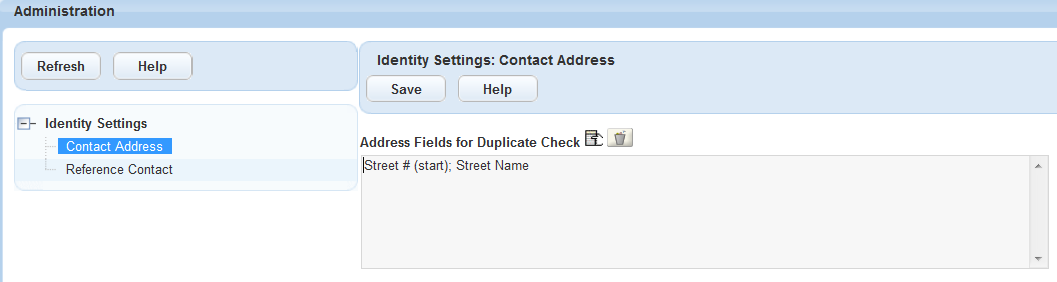 You can configure one or more contact address identifier fields. Civic Platform checks whether a contact address is a duplicate of an existing active contact address in the same contact by comparing their identifier field values (joined by AND), and prevents users from saving duplicate contact addresses.