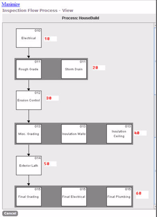 Each Inspection Group Code defines its own inspection flow process, which lists a series of tasks you must complete before issuing a certain type of permit or license. As necessary, you can set up additional inspection flow processes at any time. You can also add or delete tasks from a process at any time. However, as the inspection administrator, you must be certain to consider the effects when changing the inspection flow process after a specific inspection flow task has started.