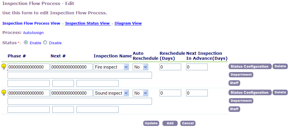 Phase # Enter the 15-digit number that identifies the position of this task in the workflow process and its relationship to other tasks. For more information about each component of a Phase number, see Designing Workflows. Reschedule (Days) The number of days before you can schedule the inspection after it enters a pending status. For example, if you set this field to 5, and the “Sewer Inspection” status changes to Pending, you cannot reschedule this inspection until 5 days pass. Staff Use the Staff button to search for a department and a staff member that is responsible for the task. Status Configuration Specify the status that the inspection type must obtain in the flow process. You can also choose to define the next step or the resulting action for the inspection after attains this status.