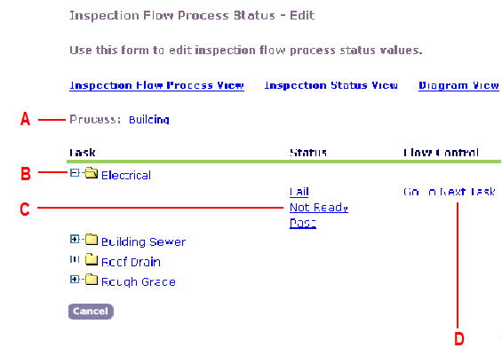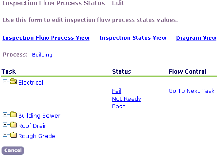 You can view the status of every task in a workflow process. The Process Statuses view, lets you see the relationship between tasks and task statuses, and link to the Inspection Flow Process Status in Figure 1.