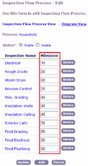 Note:Each Milestone listed on this page must have a value. To remove an inspection type, click Delete. To add an inspection type, click Add.