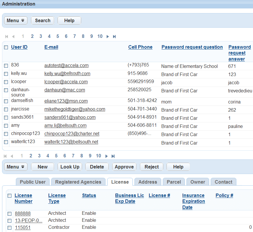 Civic Platform displays a list of Licenses that are pending, approved or rejected for the account.