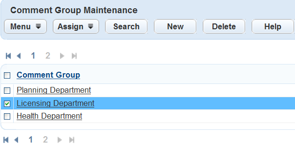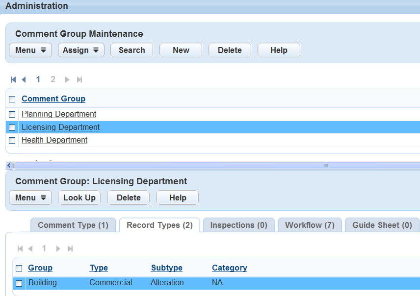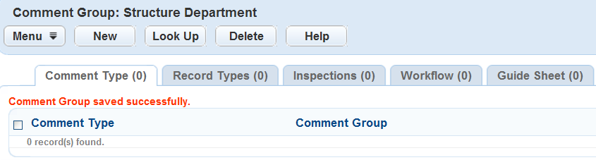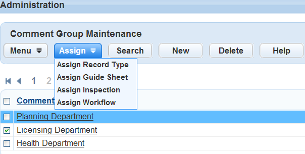 You can assign each comment group to multiple types. However, each record type, inspection type, workflow, and checklist can only have one comment group assigned to it. When you try to assign a comment group to a type that already has one, Civic Platform displays an error message.