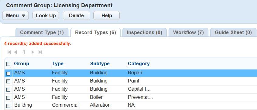 Civic Platform displays the list of record types, inspections, workflows, or checklists assigned to the comment group.
