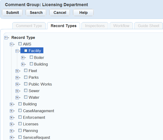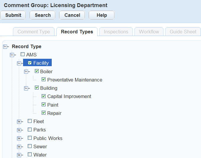 Use the + and - buttons to expand and collapse the tree to find the record type, checklist, inspection, or workflow to which you want to assign the comment group.