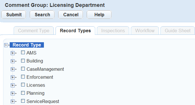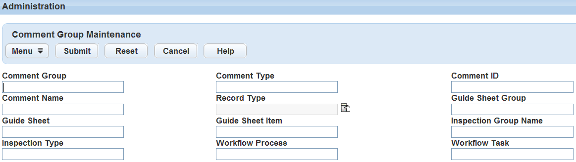 Table 1. Standard Comment Group Search Fields Comment Group Enter the name of the comment group. Comment Type Enter the name of the comment type. Comment ID Enter the comment ID. Comment Name Enter the comment name. Permit Type Enter the name of permit type for the comment group you are searching for.Click the data picker icon next to this field to choose the Permit Type from a data navigation tree. Checklist Group Enter the name of the checklist group for the comment group you are searching for. Checklist Enter the name of the checklist for the comment group you are searching for. Checklist Item Enter the name of the checklist item for the comment group you are searching for. Inspection Group Code Enter the inspection group code for the comment group you are searching for. Inspection Type Enter the name of the inspection type for the comment group you are searching for. Workflow Process Enter the name of the workflow process for the comment group you are searching for. Workflow Task Enter the name of the workflow task for the comment group you are searching for.