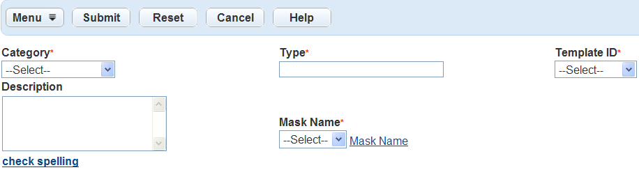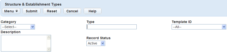Category Select either Structure or Establishment from this drop‑down menu. Type Enter a name for the Structure or Establishment type you are creating. Template ID Select a template from this drop‑down menu. For information on templates, see Working with Templates. If you choose, you can complete the Description field.