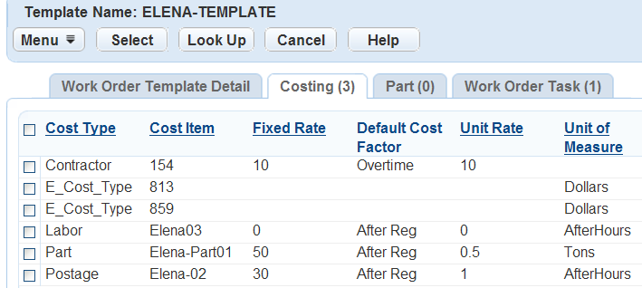 You create and maintain the costing information you associate with work orders and work order templates in the cost item definition portlet. For information on how to add cost items, see Managing Work Order Costing.