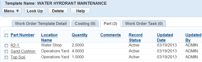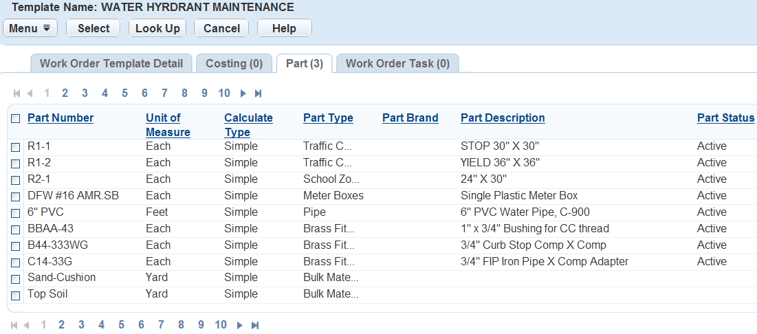 Linking parts to a work order template can eliminate user error and can limit the repetitive and time consuming data entry process of creating work orders. Your agency can define one or more templates and specify the parts to use for specific types of work orders. There are two steps to linking a part to a work order template. You must first find the parts using the lookup and you can then associate one or more parts with the work order template.