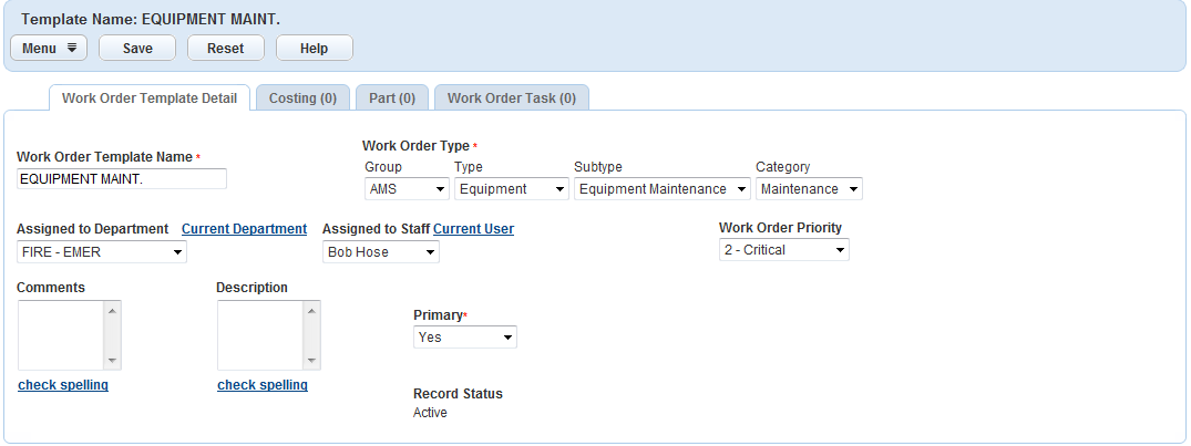 Table 1. Work Order Template Definitions Assigned to Department Select the department assigned to the work order. This field pre-populates the Assigned to Department field on the work order when creating a work order using the work order template. Assigned to Staff Select the staff member assigned to the work order. This field pre-populates the Assigned to Staff field on the work order when creating a work order using the work order template. Comments Enter any comments associated with the work order template. Description Enter the description associated with the work order template. Primary Use the drop-down list to set the work order template to be the primary one for the associated record type. When you create a work order, the basic work order information defined in the primary template automatically populates into the Assigned to Department, Assigned to Staff, Description, Work Order Type and Priority fields on the work order form. When the work order is submitted, the cost items, parts, and work order tasks within the primary template automatically associate with the work order, and they display under the corresponding tab. Record Status Record Status is a read-only field that indicates if a work order template is Active or Inactive. The record status is always Active, unless you delete the template. Work Order Priority Select the priority of the work order. This field pre-populates the Work Order Priority field on the work order when creating a work order using the work order template. Work Order Template Name Enter the name of the template created for the work order. Civic Platform uses this name to identify the template when creating a new work order. Work Order Type This field is a combination of four fields: Group, Type, Subtype, and Category. Each field is dependant upon the next. Select the work order type group. When you select the group, the type drop-down list displays. Select the type. When you select the type, the subtype drop-down list displays. Select the subtype. When you select the subtype, the category drop-down list displays. Select the category. Civic Platform uses these fields to pre-populate the work order group, type, subtype, and category when a user creates a work order using the work order template.