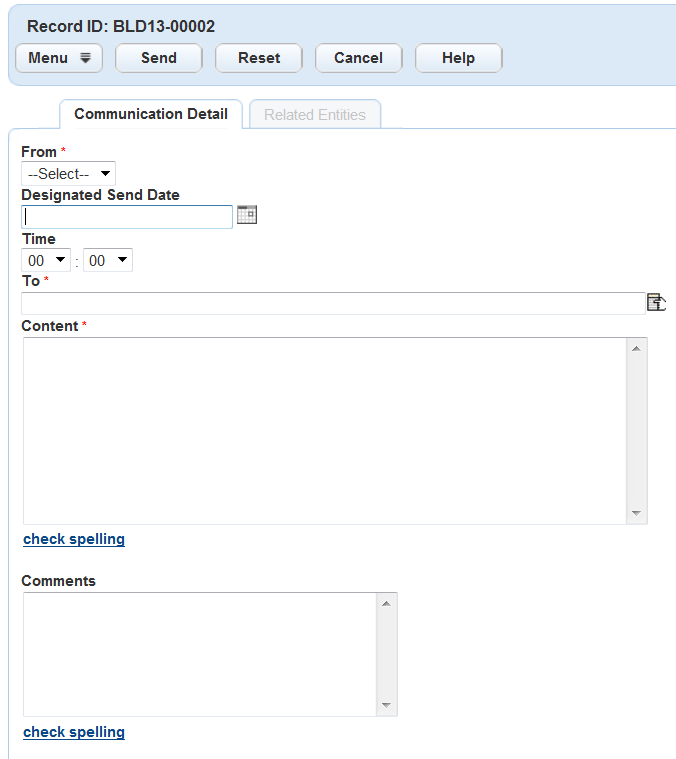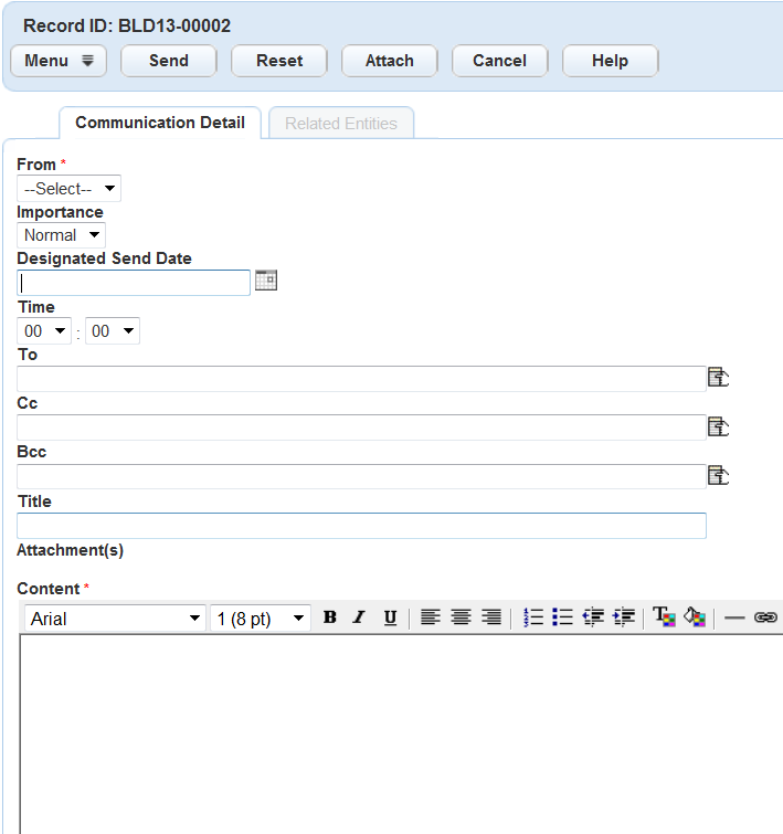 Table 1. Manually Initiated Email and Text Message Fields Email Fields: Title Enter a subject for the email. Content Enter the content of the message. You can use HTML code to create the content. You can also add parameters and embed hyperlinks to the Record Detail page in this field. You must define the parameters and URL in the EMSE scripts. For information on how to define parameters and embed hyperlinks, see Embedding Links to Record Detail Page. From Choose a value from the drop-down list. An administrator defines the values that populate this field. Refer to the Display Name setting in communication manager account settings. To, Cc, Bcc Enter an email address or click the record selection icons to the right of the fields to specify the recipient(s) of the message (Contact/Owner/Licensed Professional/ Public User). Importance Select an importance: low, normal, or high. Normal is the default. Send Date/Send Time Specify a date and time for Civic Platform to send the communication. This field is mandatory. Comments Enter the purpose of the communication, and any useful context you want to retain regarding the communication. Civic Platform does not send this information to email servers. Send Button Click to send the email or text message. Attach Button Click to upload documents as attachments to the email. After you attach a document the name of the document displays. If you want to remove the attachment, click the X button next to the attachment. Reset Button Click to remove all attachments and content from the message and reset all fields to blank fields. Text Message Fields: From Choose a value from the drop-down list. An administrator defines the display name values that populate the From field. Refer to the Display Name setting in communication manager account settings. To Enter a cellular phone number or click the record selection icons to the right of the fields to specify the recipient(s) of the message (Contact/Owner/Licensed Professional/ Public User). Content Enter the content of the message. Designated Send Date Specify a date and time for Civic Platform to send the communication. This field is mandatory. Comments Enter the purpose of the communication, and any useful context you want to retain regarding the communication. Civic Platform does not send this information to SMS servers. Send Button Click to send the text message. Reset Button Click to remove all content from the message and reset all fields to blank fields. Click Send.