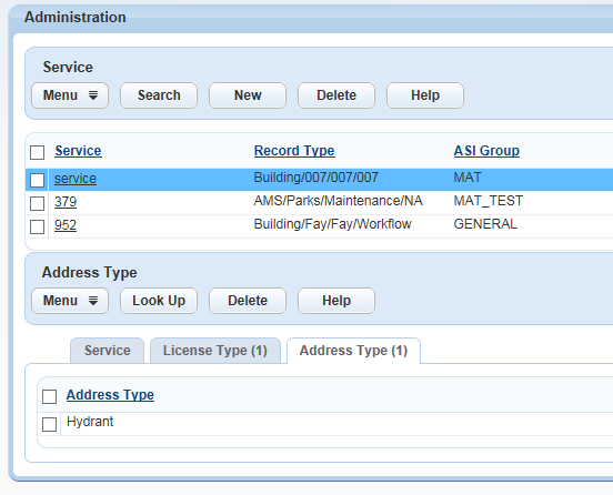 Manage the services offered by associating the services with a record type. You can also associate the service with a licensed professional type. For example, a licensed commercial contractor can have access to request plumbing or water service repairs. You can also associate an address type with a service. For example, 123 Main Street is a commercial building and has access to roof repair, water, and plumbing services offered by the State, county, and city. For more examples of service configurations, refer to Services Example Configurations.