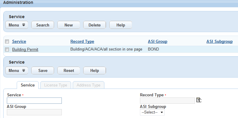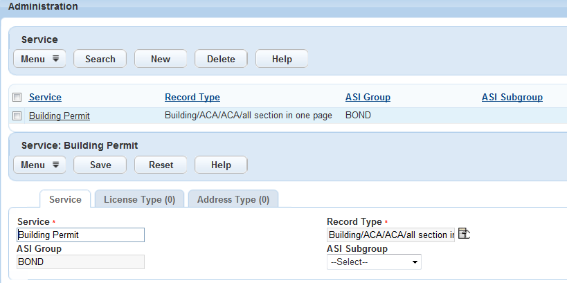 Table 1. Service Field Descriptions Custom Fields Group This field automatically populates based on the selected record type. Custom Fields Sub Group Use the drop-down list to select the Custom Fields sub group, or leave it empty. The Custom Fields sub group sets the scope of the service to a specific portion of the record type. If you do not specify the Custom Fields sub group, the service scope is identical to that of the record type. Record Type Click the picker icon to select the Record Type you want associated with this service. Service Enter the name of the Service. Table 2. Services Example Configurations Agency Service Name Record Type Custom Fields Group Custom Fields Sub Group Associated Licensed Professional Associated Address Type Group Oregon Water Heating Plumbing Plumbing_ services - Contractor Address Type Group 1 Oregon New Drain Plumbing Plumbing_ services New Drain_Info Architect Address Type Group 1 and Address Type Group 2 Eugene Re-roof Structural Structural_ services Re-roof_info Contractor Address Type Group 1 Portland Fishing Fishing Fishing_ services Fishing_info Address Type Group 2
