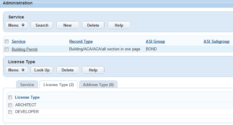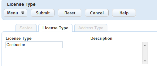 You can associate a license type with a service, which provides a way for a user to view services and request services appropriate to their license type. For examples, refer to Example Multi-Agency Services and Licensed Professional Type Associations.