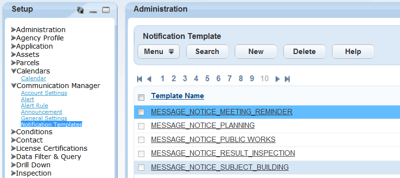 The notification template list includes custom notification templates, created by administrators for Civic Platform and Citizen Access. The notification template list also includes pre-defined system-level templates, available out of the box, which administrators can customize to suit the agency’s business objectives.