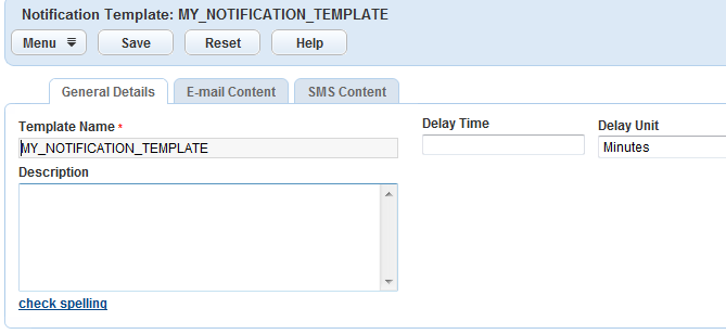 Table 2. Communication Manager, Notification Template, General Details Tab Template Name Enter a name for the template. Description Enter a description of the template’s purpose. Delay Time and Delay Unit Enter the number of minutes, hours, or days you want to delay sending the message and choose a time interval (minutes, hours, or days) in the Delay Unit field. For example, if you want to send inspection results after 14 days, enter a delay time of 14, and then specify “days” as the delay unit in the next field.