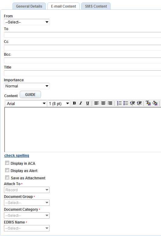 Another use case is to configure a script that attaches all emails sent to a Cc or Bcc to records in Civic Platform.Title Enter an email subject or enter an EMSE parameter. To use parameters you must define the values in the EMSE scripts that initiate the communication. For complete details about working with EMSE, refer to the Accela Civic Platform Scripting Guide. Importance Select an importance: low, normal, or high. Normal is the default. Content Enter the content of the message. In addition to standard message text, you can: -- Include variables in the message body. Refer toVariables for a full list.